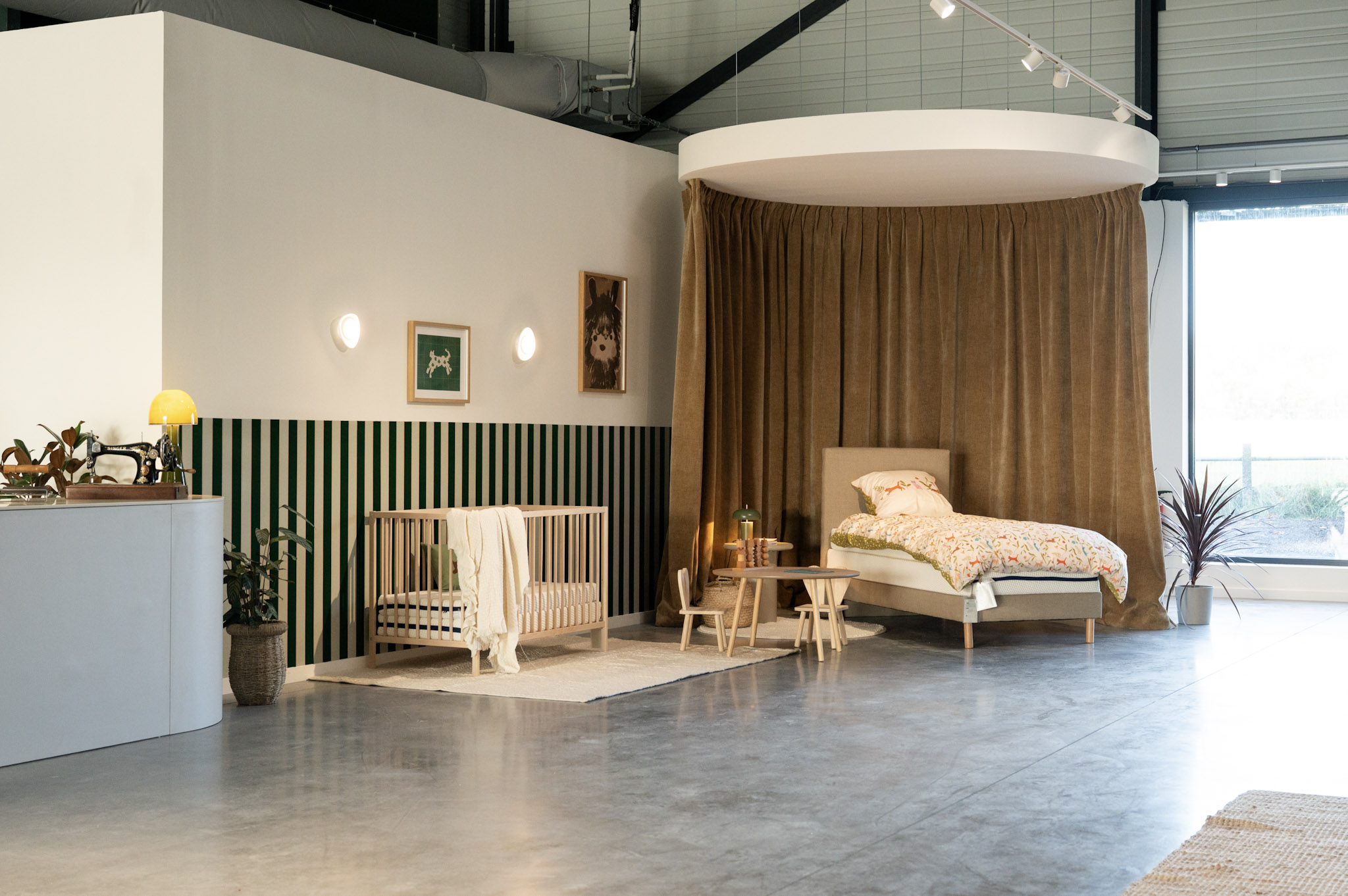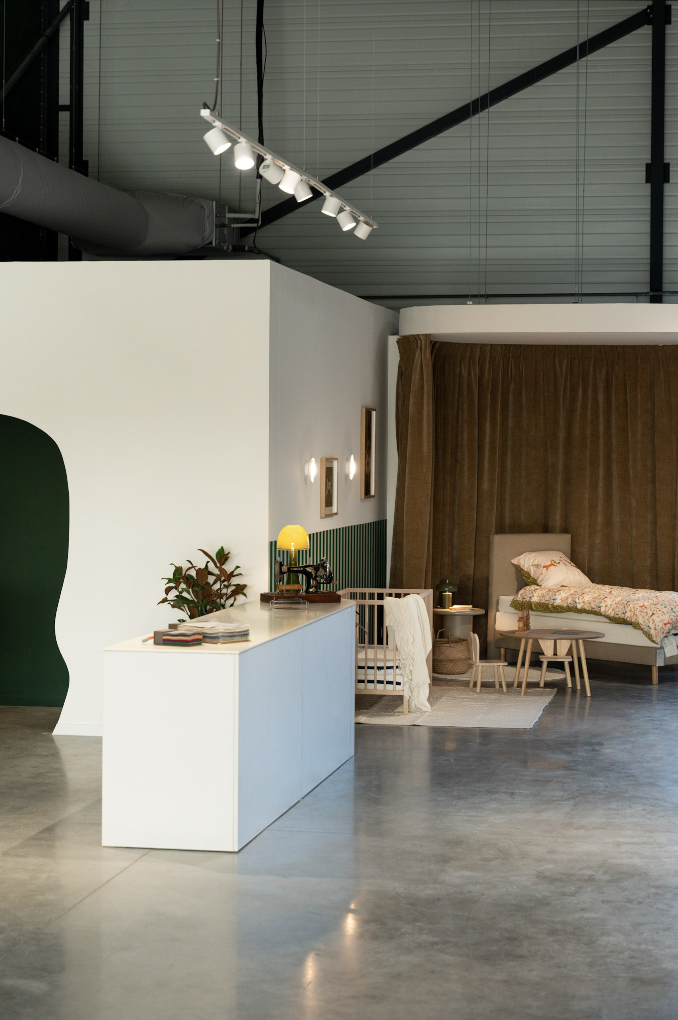 Dans une boîte vide de six mètres de hauteur (bâtiment neuf), avec un sol en béton brut, le concept a été de concevoir un espace chaleureux en dessinant des lignes arrondies et douces, en reprenant les codes de l’habitat afin de plonger le visiteur dans une atmosphère de cocon.